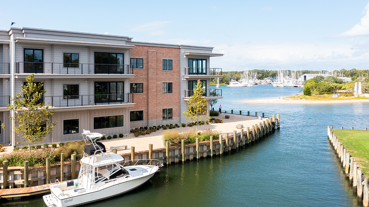 A few feet away, your neighbors are getting into their boat for an early evening jaunt. As you make your way up the newly paved path and into the bright lobby of your building, you take the elevator upstairs to a three-bedroom loft, where you prepare dinner in an open-concept kitchen and enjoy the sunset as it spills into the dining area. You end the day downstairs in your private yacht club-style entertaining space, having drinks with friends. You plan to do it all again tomorrow.