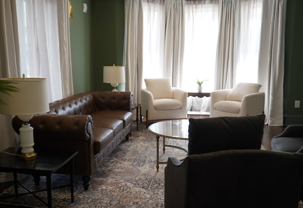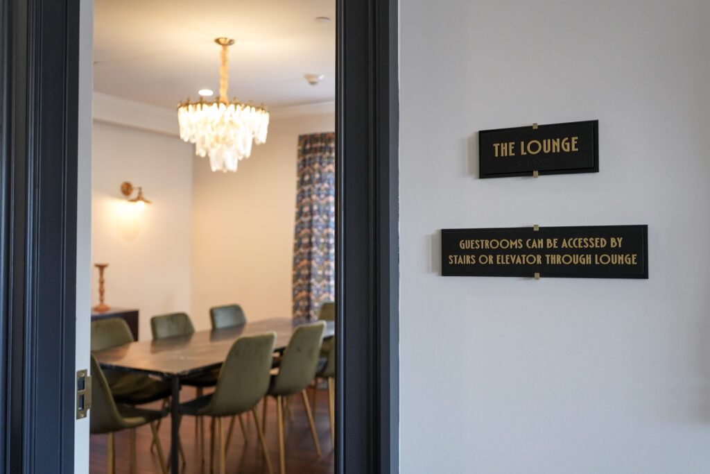 On the first floor, guests can get cozy in a communal living room around an original fireplace that has been restored to its former glory. The first floor also features a full dining room — an art-deco inspired space where a dramatic chandelier hangs over a set of green velvet chairs and communal table that guests can use during their stay. Designed with bridal parties in mind, the downstairs space also includes a “parlor room” where guests can get ready for their big day. The space is equipped with a floor to ceiling mirror, two chaise lounges, large windows, good lighting and a shuffleboard table for guests waiting to get their hair and makeup done.