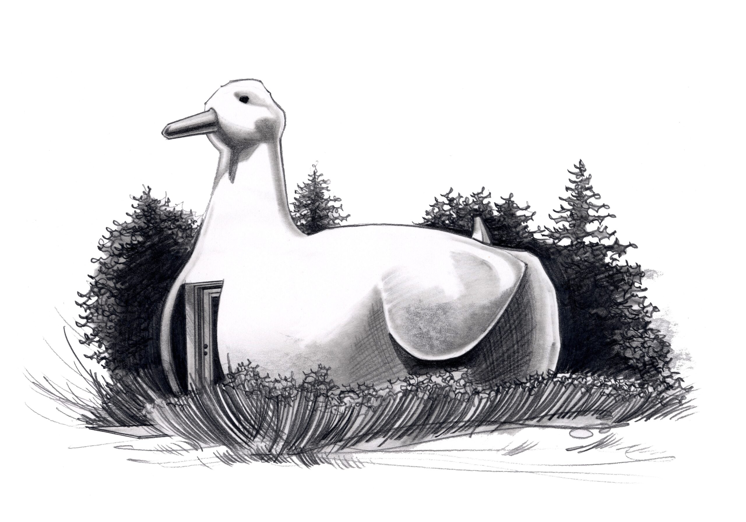 The Big Duck was commissioned by a duck farmer named Martin Maurer, who was inspired by a coffee-pot-shaped building that he saw on a road trip to California. With so many competitor duck farms on Long Island, he decided to transform his farm stand into a giant duck to garner attention from passersby. He employed local carpenter George Reeves and Broadway set designers the Collin Brothers for the job; they constructed the large fowl by applying ferrocement over a timber frame and wire mesh. It was an impressive architectural feat, one that influenced architects Robert Venturi and Denise Scott Brown to coin the term “duck architecture,” which is used to describe buildings that are designed to look like what they sell inside.
