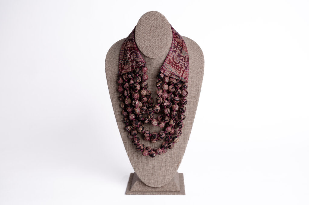 The cotton “beads” on this necklace are made by taking recycled cotton cutoffs and rolling them into balls. They are then overstitched with colorful cotton thread. The necklaces are made by hand in Rajasthan, India.