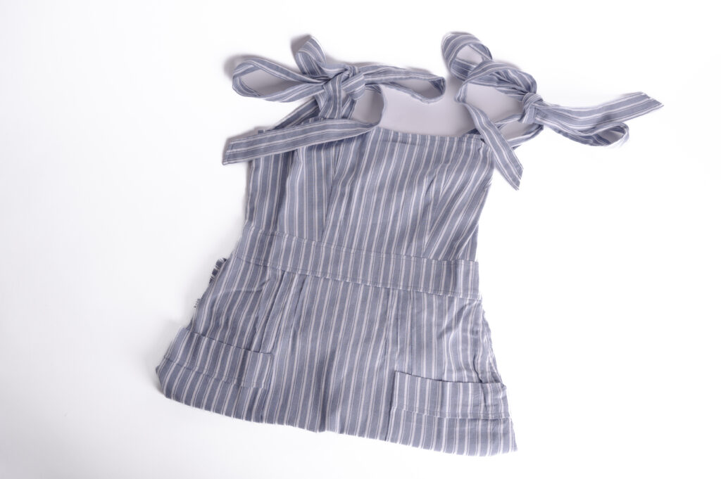 Lido’s apron dress has a fitted bodice with two front pockets and adjustable tie shoulder straps. This blue and white striped cotton version can be dressed up or down for work or play.