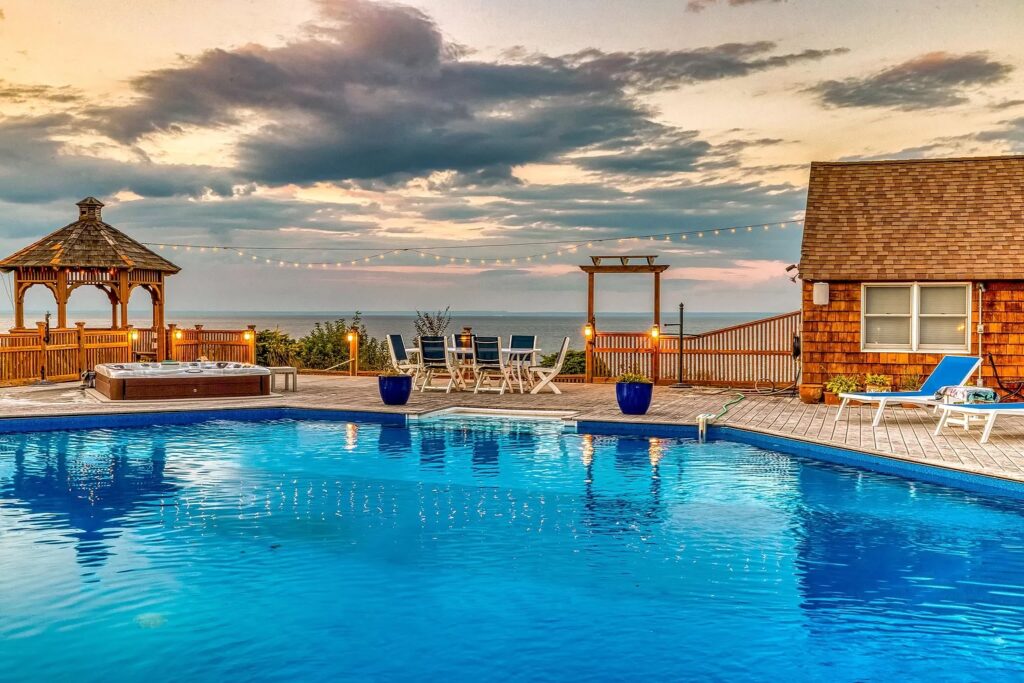 As they say, go big or go home. And if you choose the former, then this four-bedroom, 3.5-bath house on the cliffs is your end-of-summer rental, available only for August through Labor Day. What’s “big” about this house, smack on Duck Pond Point, is the view over Long Island Sound,. The house leverages its privileged location with a wrap-around deck, windows everywhere, cathedral ceilings with skylights, and a windowed sunroom. The downstairs open format includes plenty of spaces for gathering. The upstairs mezzanine is equipped as a work space with a reading nook and telescope for stargazing. Bedrooms are in a connected annex with deck and pool access, and its own elevated deck. The large deck with its pool and hot tub is the spot for swimming, sunning, supping and staring over the water. A private walkway leads to the beach.