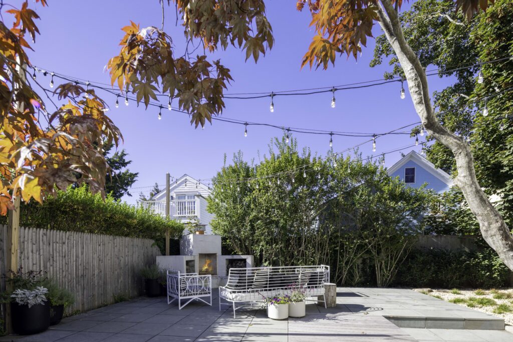 The backyard is paved with bluestone, ringed by privacy hedges and features a wood-burning brick chiminea