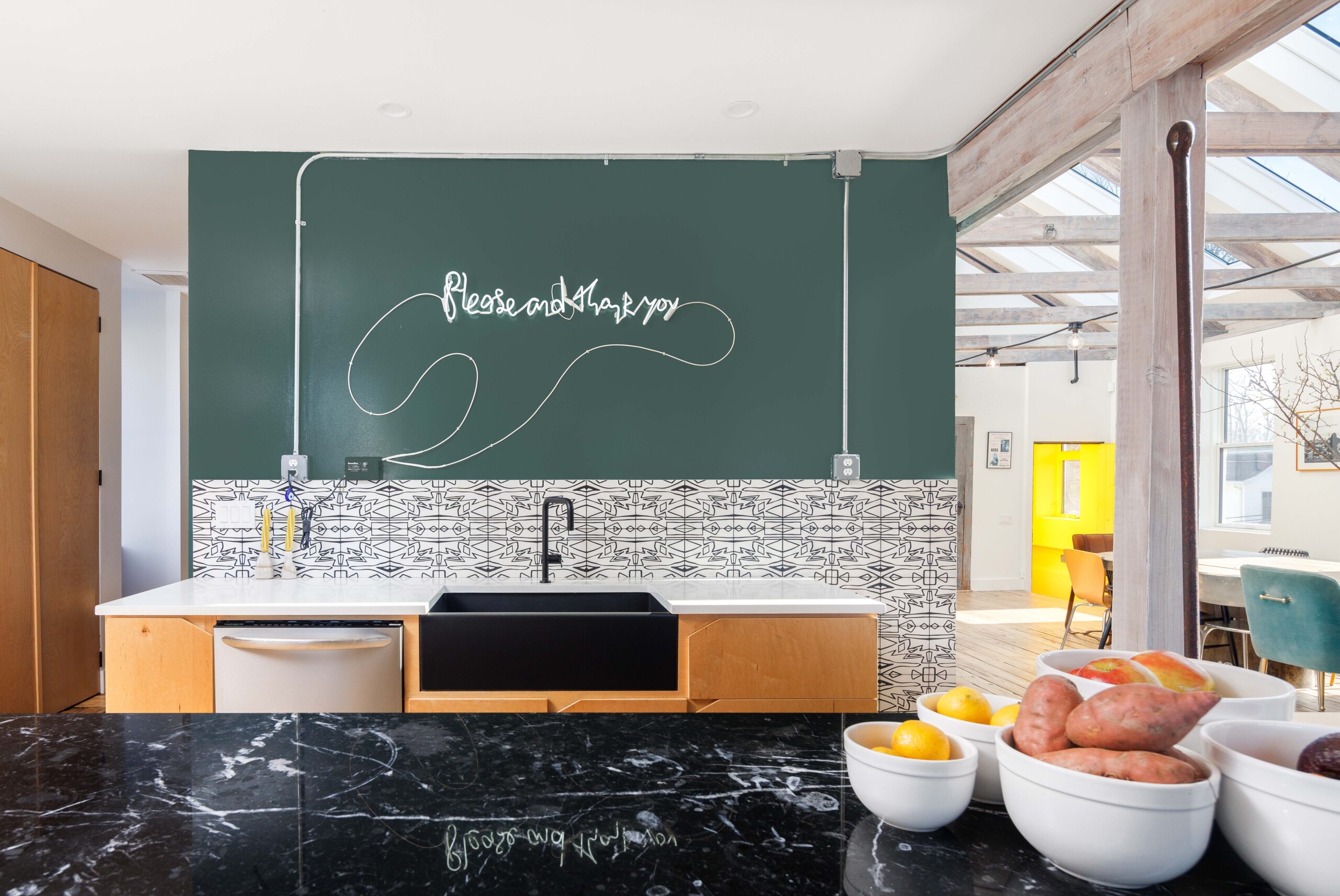 - 12 skylights let in ample natural light, thanks to the open cathedral ceiling with the original exposed rafters.