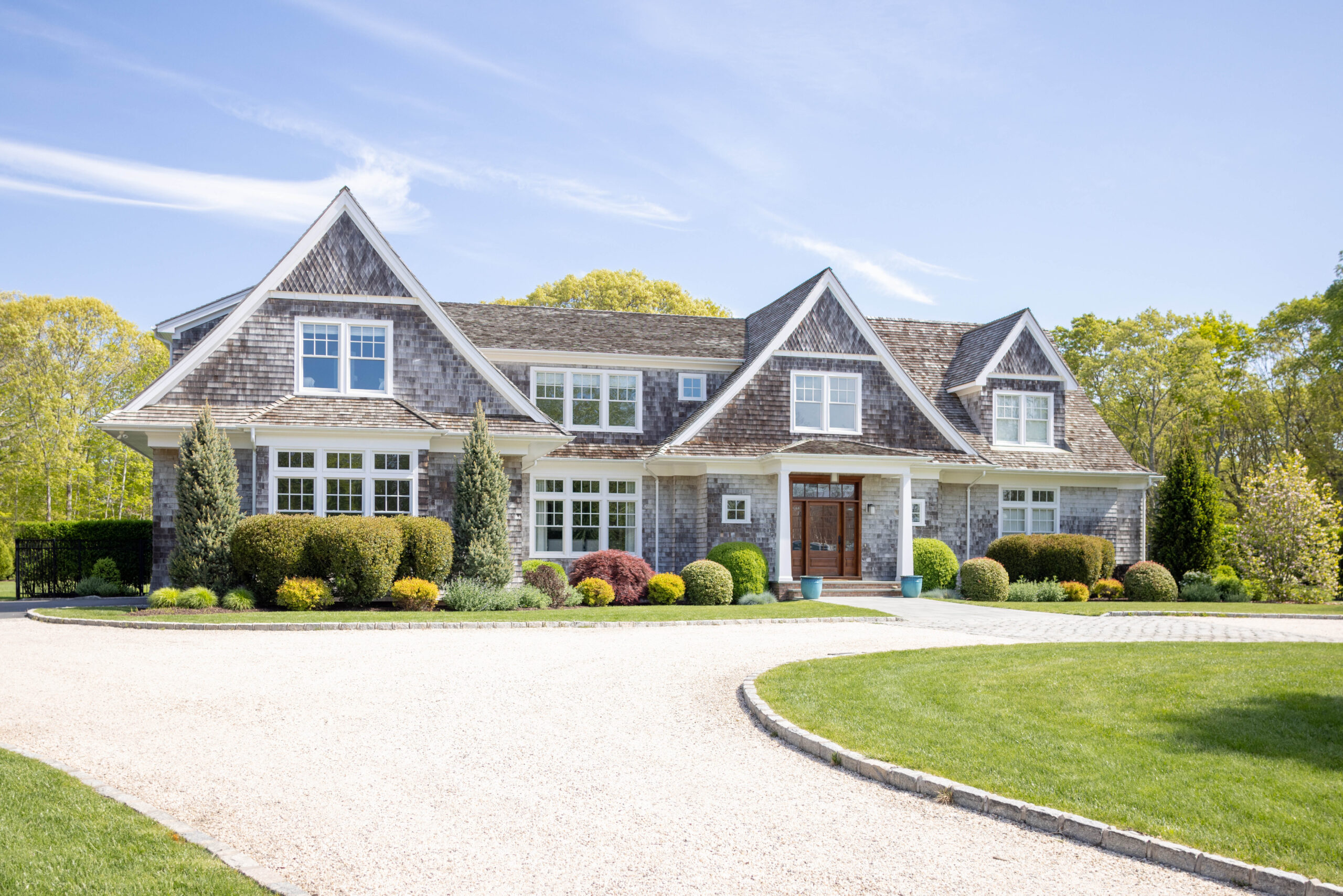 Built and designed by the current owners in 2015, this home’s sloping roofs and wraparound porch are the signature features of this traditionally styled house in Southold.