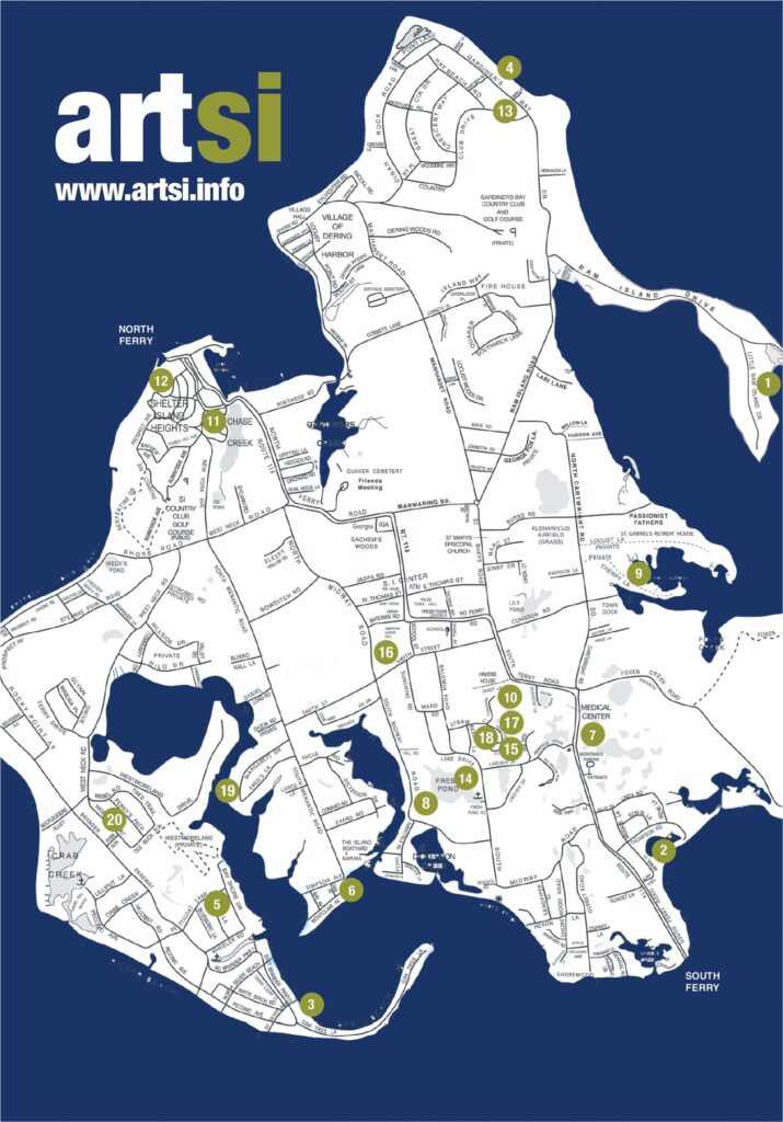 ArtSI created a handy-dandy artist map to create your own self-guided art perusal. The following artists correspond to the numbers on the map as part of this year’s tour: