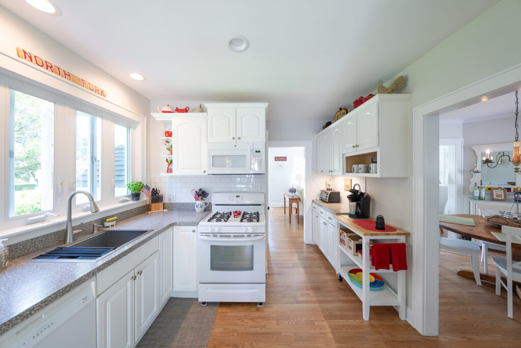 The kitchen offers ample storage space in the upper and lower cabinets, updated appliances. The retro-style, updated Formica countertops are in sync with the vintage vibe of the house. A sliding door gives access to additional dining on the deck.