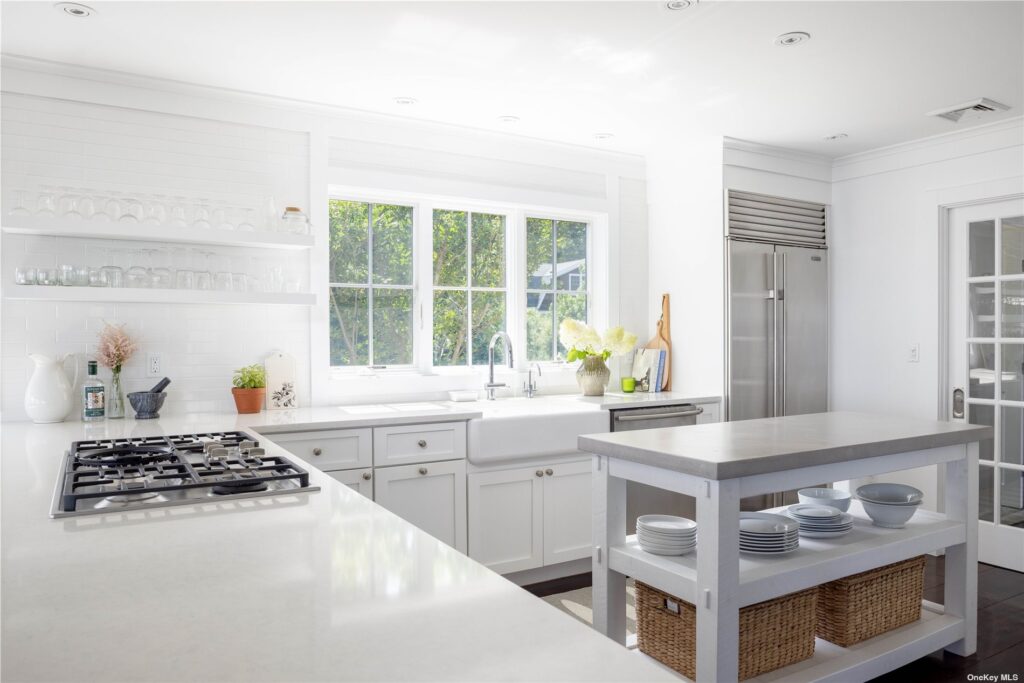Renovated under current ownership, the kitchen includes a Sub-Zero refrigerator, Thermador stove and Bosch dishwasher, Shaker-style cabinets and open shelving. The center island features a custom polished-cement counter top. “She achieved a modern clean interior with organic elements that soften [it],” Elkin says.