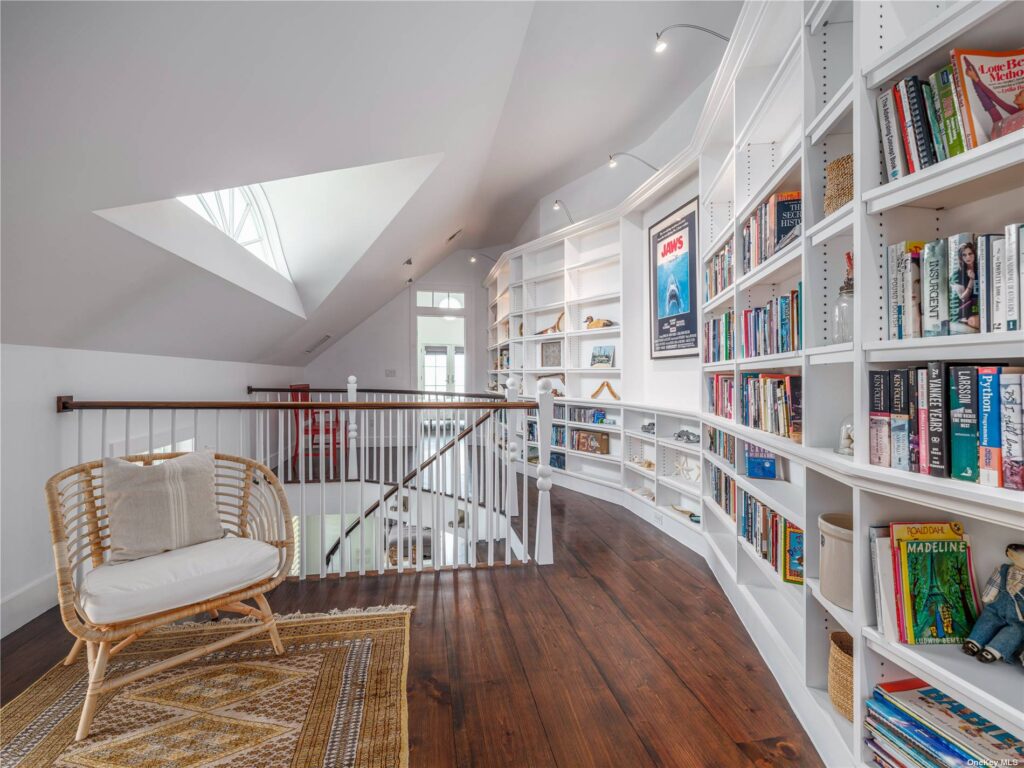 Custom built in bookshelves line the second-floor landing, which has a skylight with a window inset and currently used as a reading nook.