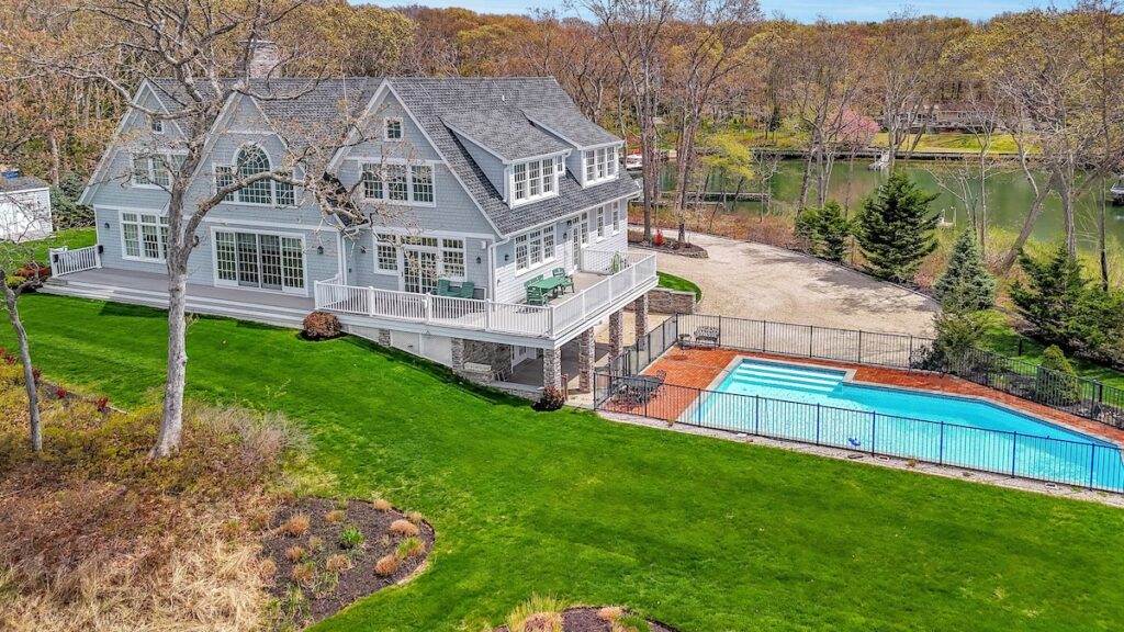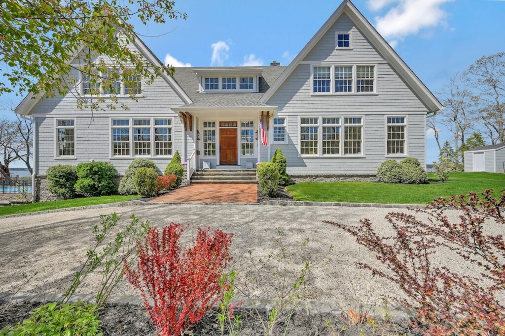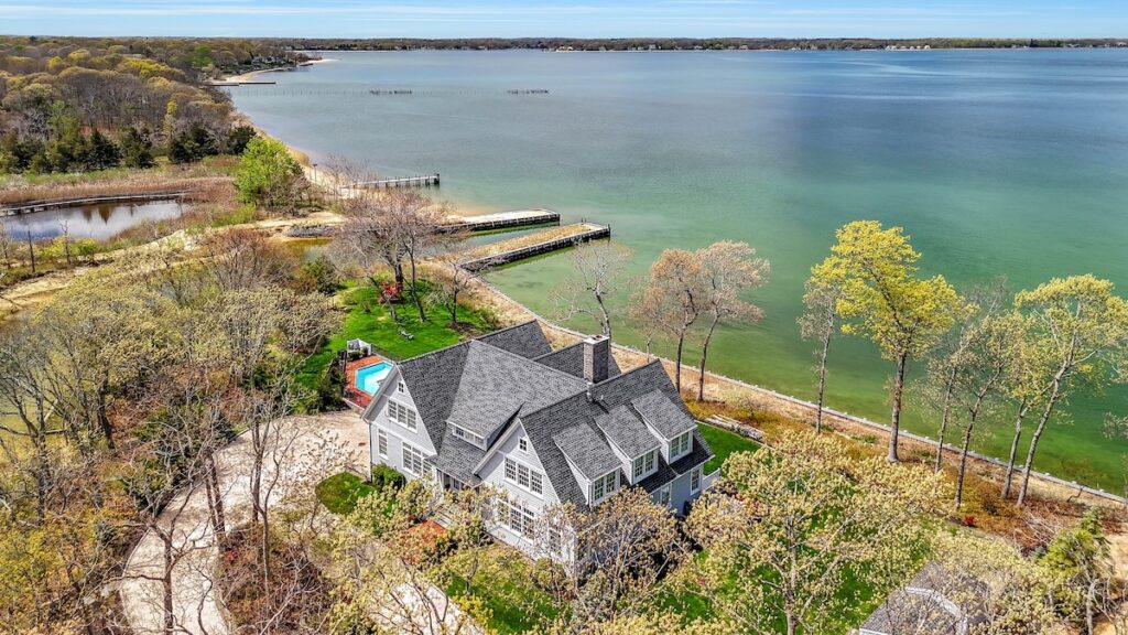 Built in 2011, this Nantucket-style home is sited on 1.8 acres in Southold’s Paradise Point Community. It includes 994 feet of shoreline, a deep-water dock and expansive views on three sides across the bay to Shelter Island. The house optimizes its waterside location with views from the semi wrap-around deck and inside the home.