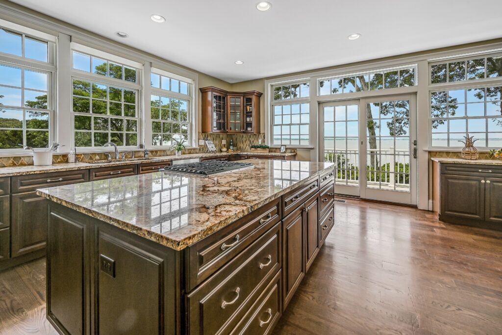 Overlooking the bay and pool, the 450-squre-foot chef’s kitchen is equipped with stainless-steel appliances and granite counters top the custom cabinetry. There’s ample space to create a casual dining in between the kitchen and great room.