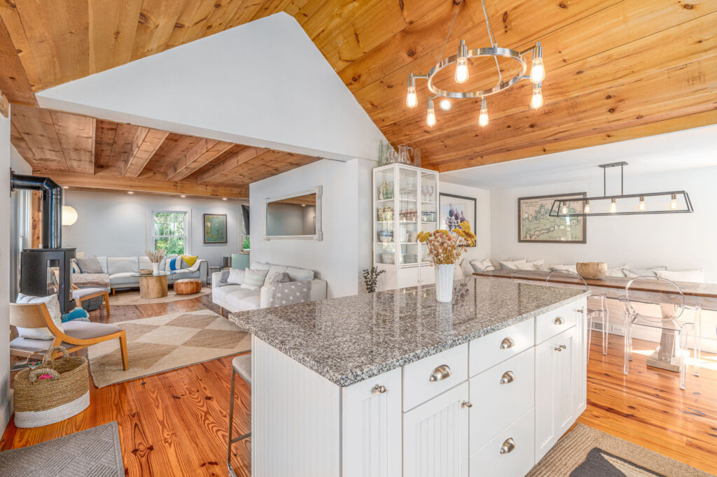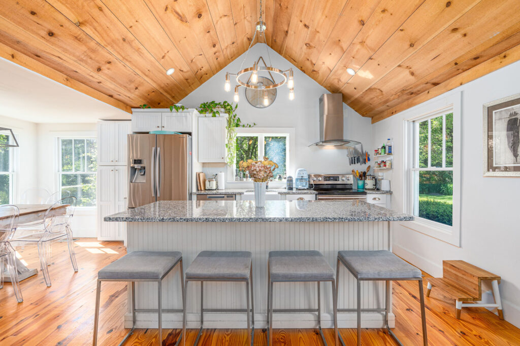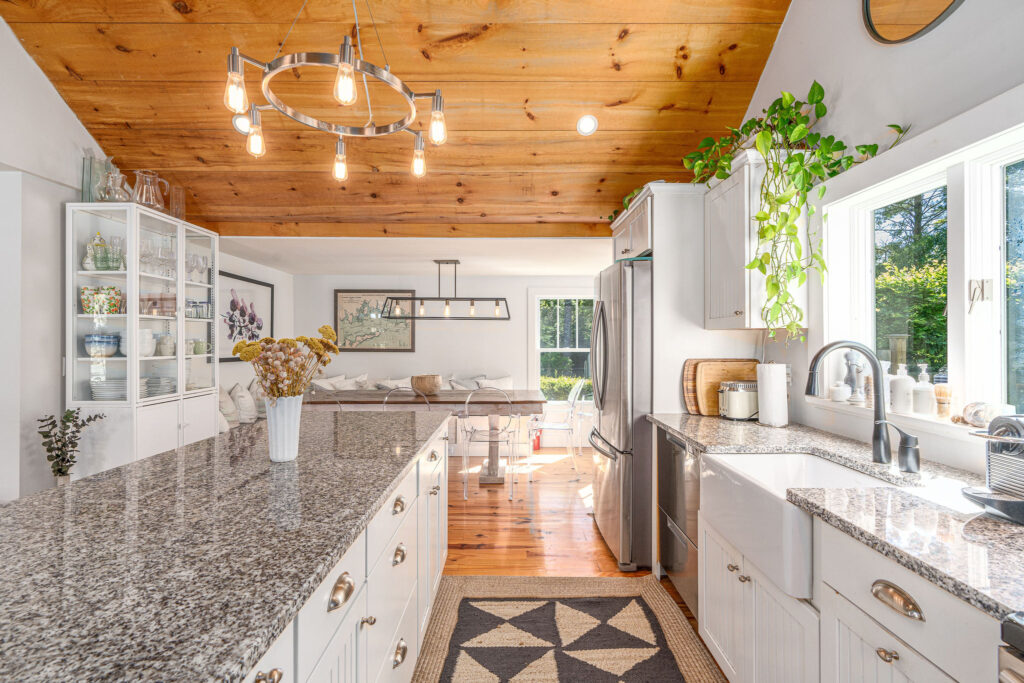 This compact farmhouse kept its 1890 farmhouse vibe through a renovation that opened up the rooms and updated the kitchen and bathrooms. The aesthetic details throughout include wood-beamed ceilings, wide-plank floors, white washed finishes and Porcelanosa fixtures and finished in the bathrooms.
