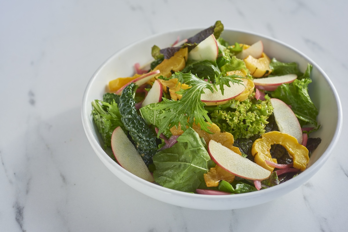 This salad perfectly complements local honey crisp apples, roasted squash, pickled onions, grilled chicken, or shrimp. Making the vinaigrette ahead will allow you to serve a quick, healthy weeknight meal in no time.