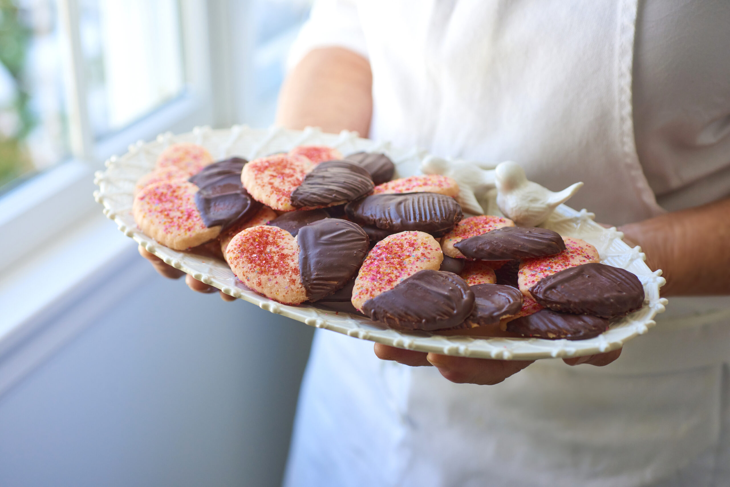 “This is my go-to Christmas sugar cookie, revamped with red food coloring for Valentine’s Day,” says cookie aficionado Linda Zavatto. This heart-shaped treat, sprinkled with pink sanding sugar on one side and rich dark chocolate on the other, will most likely break a few hearts once they disappear.