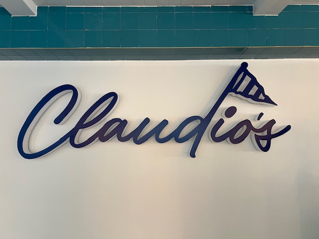 Replacing the space that once held the Virgil’s Real Barbecue, the sprawling spot is entered from the Coral hotel, where you’ll immediately find the Claudio’s sign in navy blue cursive hung on a white wall rimmed by turquoise tile.