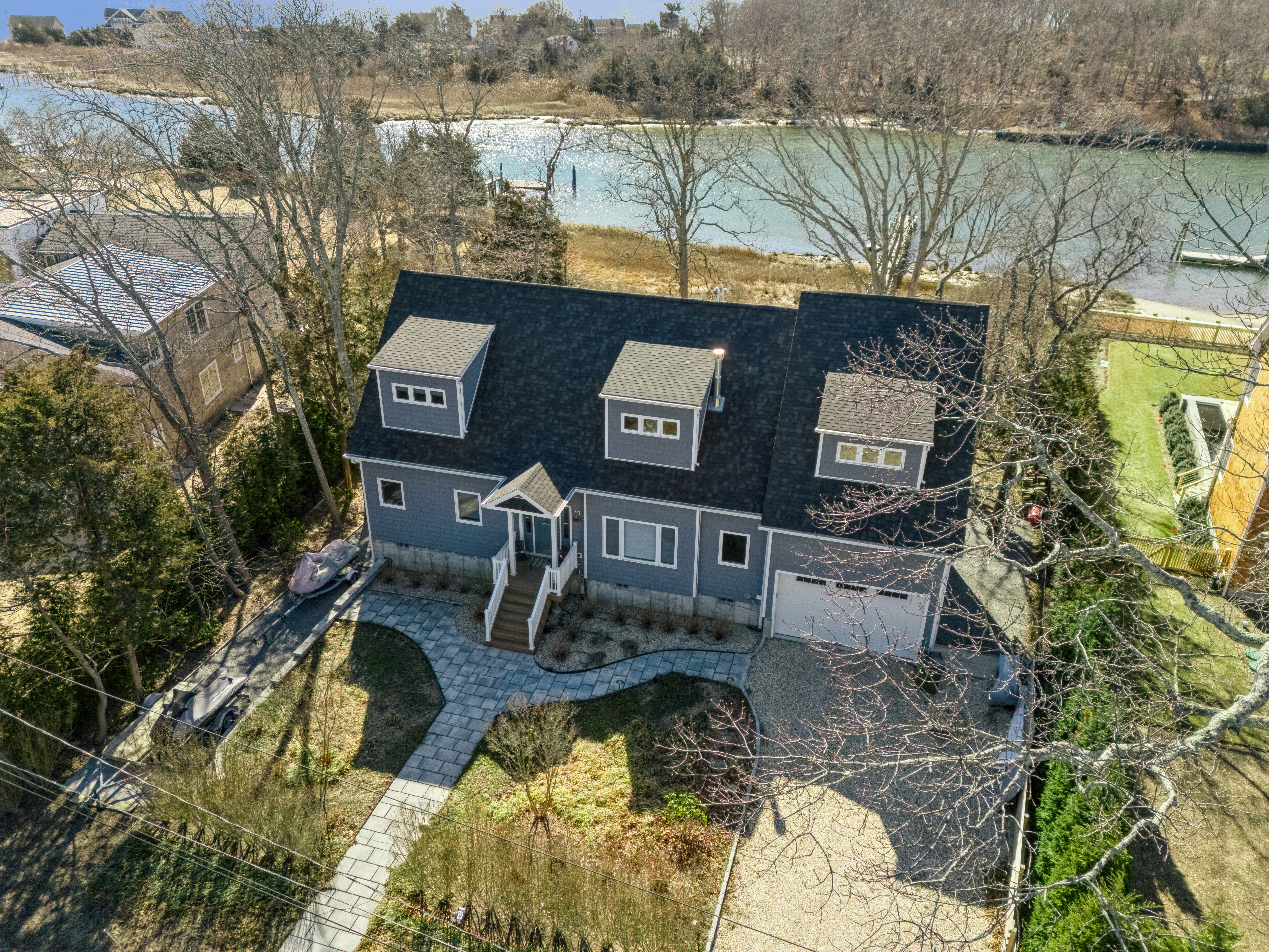 The basement has sliding doors to the back yard and has potential for becoming a customized finished space. There is a firepit/conversation area in the backyard, which features natural landscaping in keeping with the maritime environment.