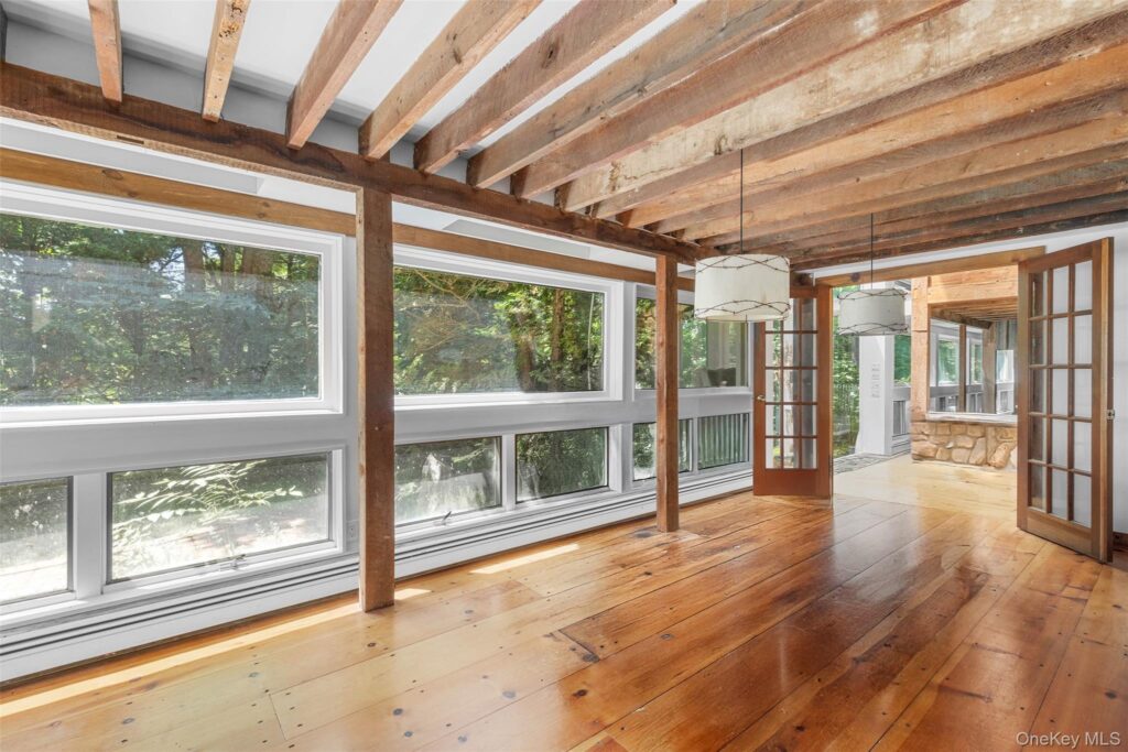 The country-style kitchen repeats the wood-beam and plank floor themes and offers access to the 3,100-square-foot wood-plank deck adjacent to the swimming pool.