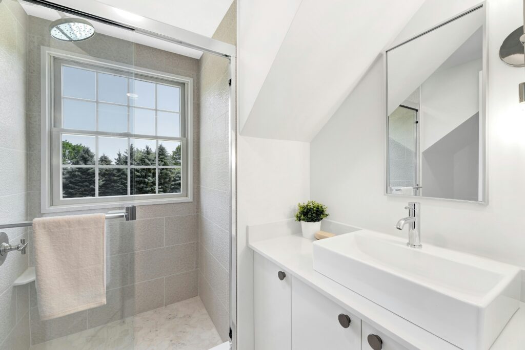 The bathrooms were renovated with a variety of mixed metals, giving a stylish, finished look to each. The upstairs bathroom has a stand up tile shower built around a window, offering, Peddy says, “the best view in the house.”