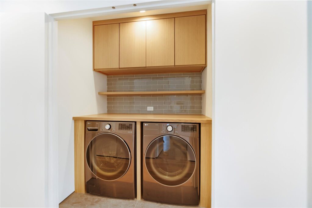 The home makes use of natural wood tones in the custom mill work such as the floating staircase, cedar-slatted accent walls and white-oak flooring throughout. The garage has a storage loft.