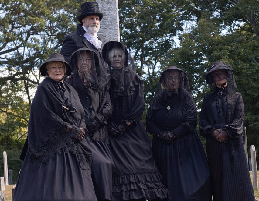 the graveyard by a group of silent “widows” dressed in black Victorian mourning clothes.