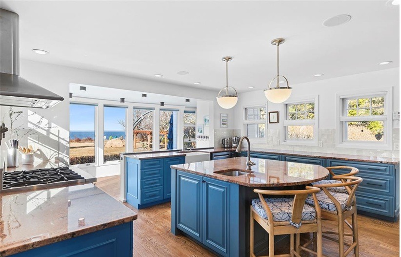 The sunny kitchen has a porcelain farm sink set into pretty slate-blue custom cabinetry topped with granite. The center island has a convenience sink and seating for at least three and an integrated wine fridge. The stainless-steel appliances are chef-quality and include two dishwashers.