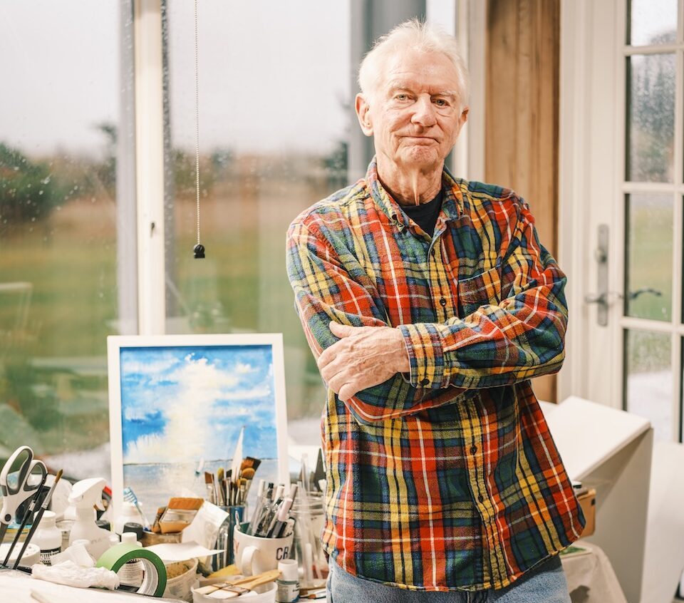 Wine pioneer Kip Bedell in his home art studio. See his paintings at Lenz this weekend. (Photo credit: Jeremy Garretson)