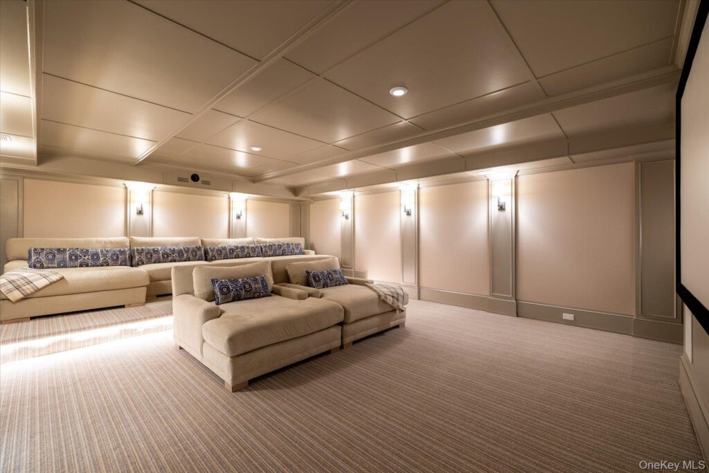 The lower level features a 1,180-square-foot rec room with 210 square feet of bar area; a 326-square-foot gym, the home theater with beverage station, wine cellar, a full bathroom and an office. Most of the gym equipment will transfer with the sale.