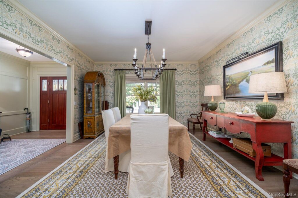 Anchored by an oversized farm table island, the chef’s kitchen features plenty of storage space, and a Wolf six-burner/grill dual oven and the other appliances include dual dishwashers. The butler’s pantry is equipped with small appliances. The custom cabinetry is topped with granite counters.