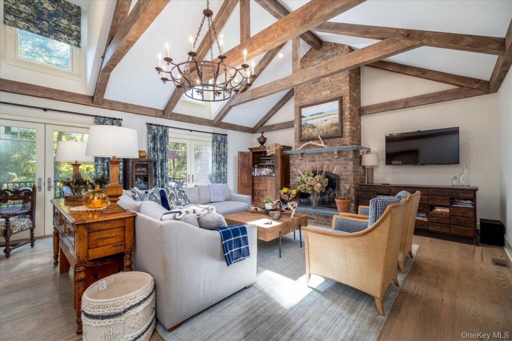 The privacy and amenities in “this remarkable woodlands setting make this a great space for entertaining” says Bennett, calling out the well-appointed pool area and the cozy lower-level fireplace “for football game days.”