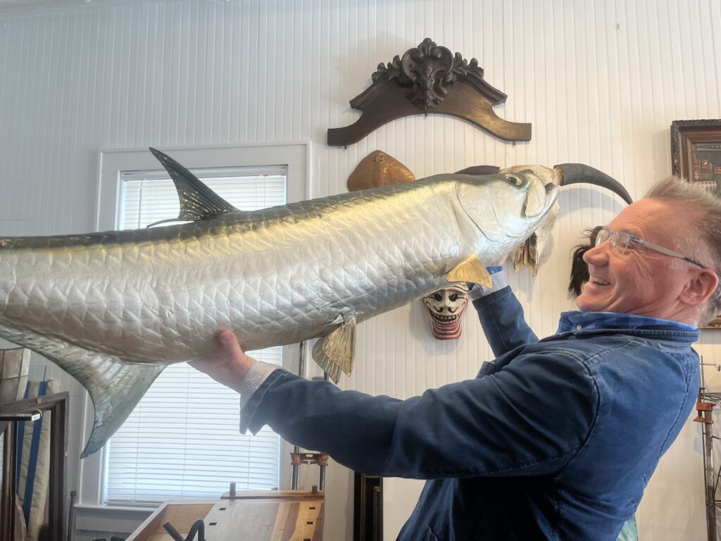 Restoration work will be ongoing, too, with Hoff currently restoring a Renaissance Revival carved oak screen and Lisa repainting an enormous trophy tarpon, which the couple figures is over a hundred years old. “He’s going up on the wall soon,” Feuerherm says. “Mark did the structural repairs, and I did the painting and refinishing of it.”