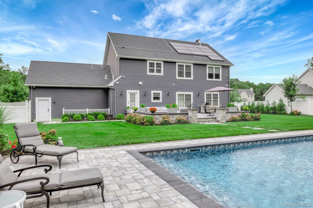 Things to see: A welcoming rocking-chair porch is the precursor to a double-height foyer and impressive staircase. A gas fireplace warms the main family room, built-in shelving and an updated eat-in kitchen with a dedicated beverage station, lounging area, and access to the back patio. The large back yard features a new saltwater heated pool and solar panels add sustainable efficiency.