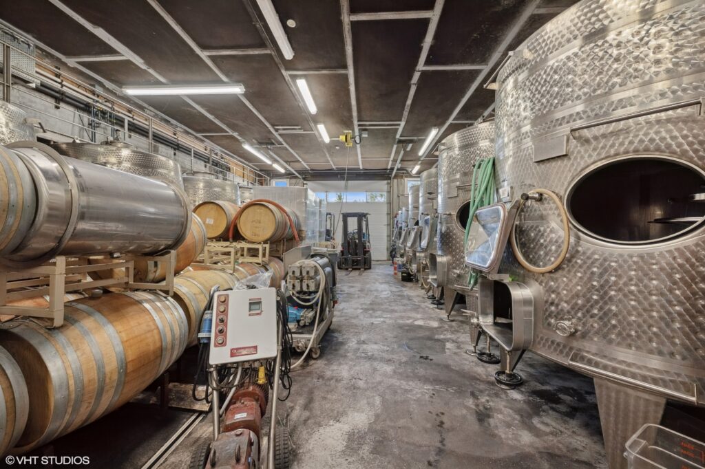 The 27-acre parcel includes 16 acres of sustainably farmed vines, state of the art distilling equipment, the recently renovated and expanded 13,000 square foot wine production facility, new 2,600 square foot tasting barn with original wood beams and approved expansion to accommodate large scale events, a 4,000 square foot storage barn, approved on-site workforce housing, as well as a residential building lot accessible via Chardonnay Drive.