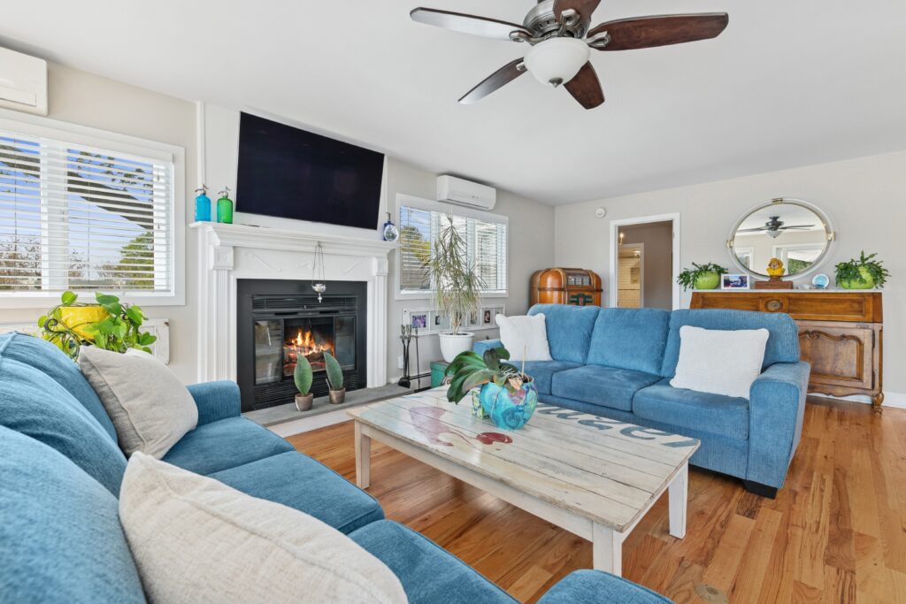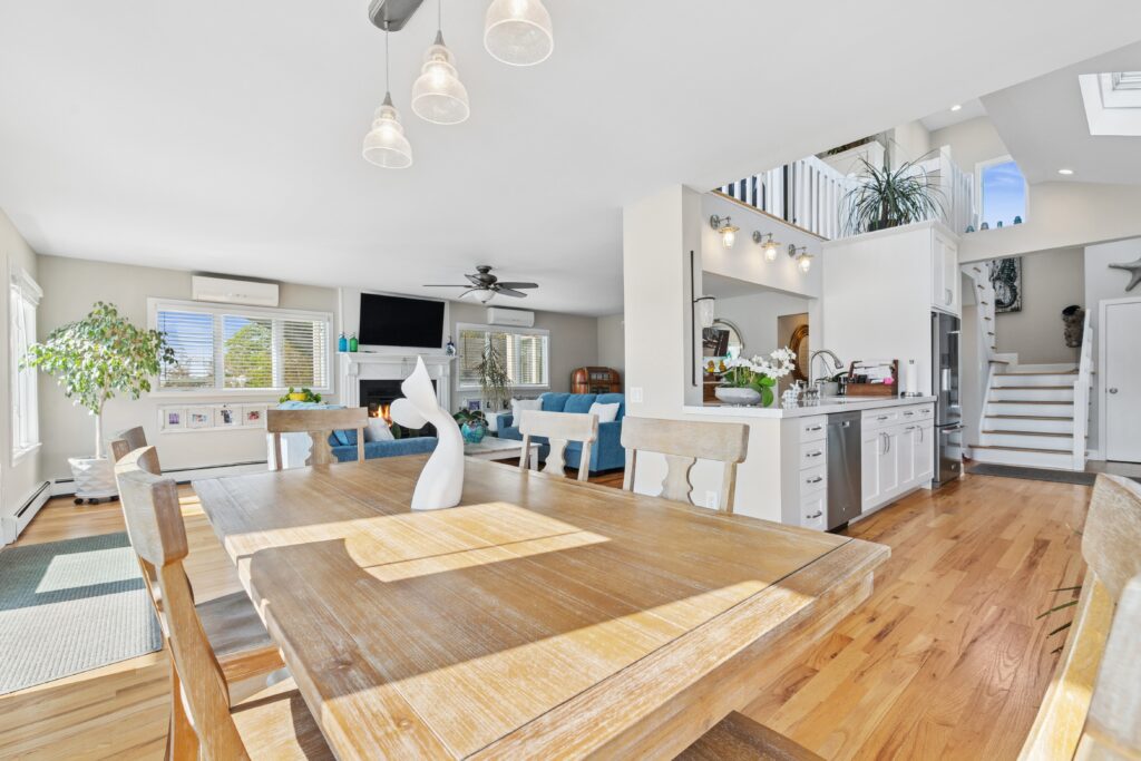 The main floor features a bright and airy open-concept floor plan with a 400-square-foot living room anchored by a wood-burning fireplace that leads into a dining area of 108 square feet.