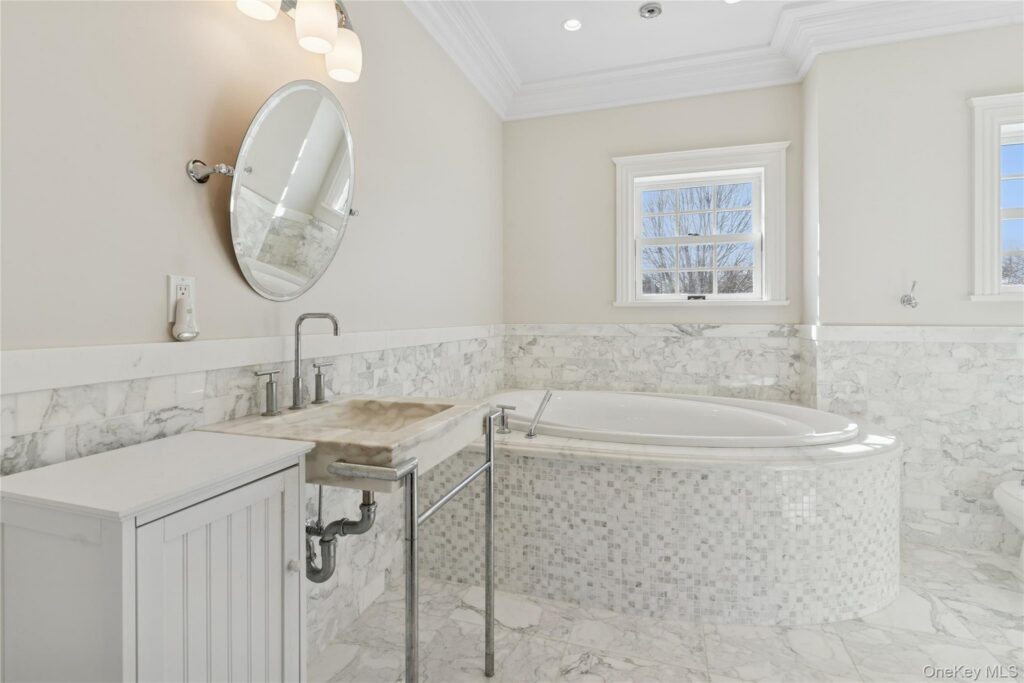 Things to see: A cedar-shingled ranch on a setback plot with stone walls and steps creating a dynamic landscape and setting the tone for the recurrent stone theme inside. Open format features a fieldstone fireplace and a center dining island in the kitchen. Backyard deck overlooks the swimming pool. Additional dining under the pergola and at the bricked firepit area.