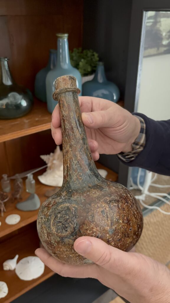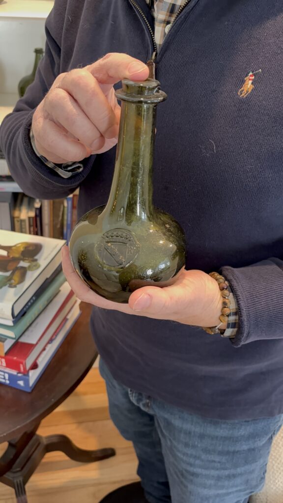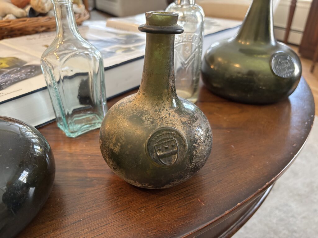 Now, Michael’s collection, valued at over $500,000, includes several dozen English onion-style, dark green, brown and blackish bottles with broad round bases and short necks. Some bottles feature damaged lips since they predate the modern corkscrew, and instead had wooden stoppers with gauze, wax and something to tie it closed, plus unique seals specific to the owner or bar the bottles represented.