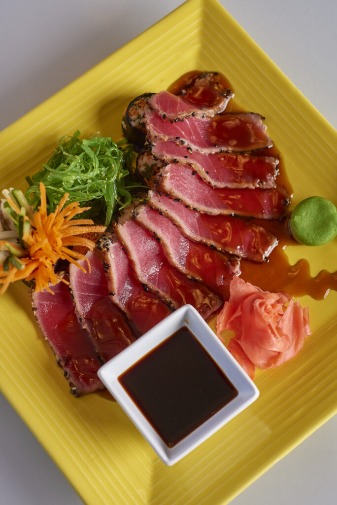 Velvety slices of sesame-crusted ahi tuna dissolve in your mouth and are complemented by the crunch of seaweed salad and vegetable noodle rolls served with a side of pickled ginger and soy sauce.