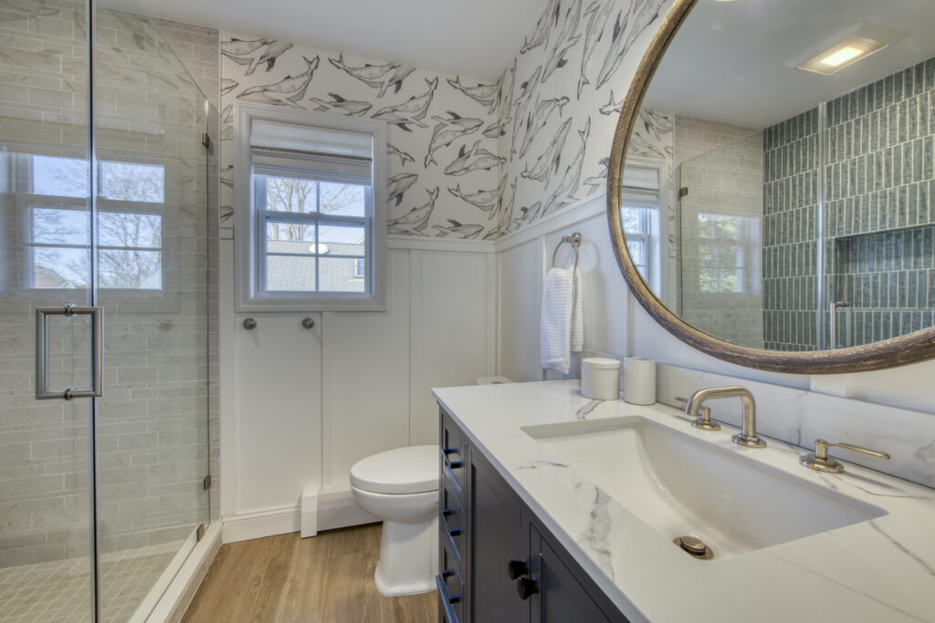 Custom wallpaper includes a whimsical whale design in the bathroom and organic florals in one of the bedrooms above the paneling.