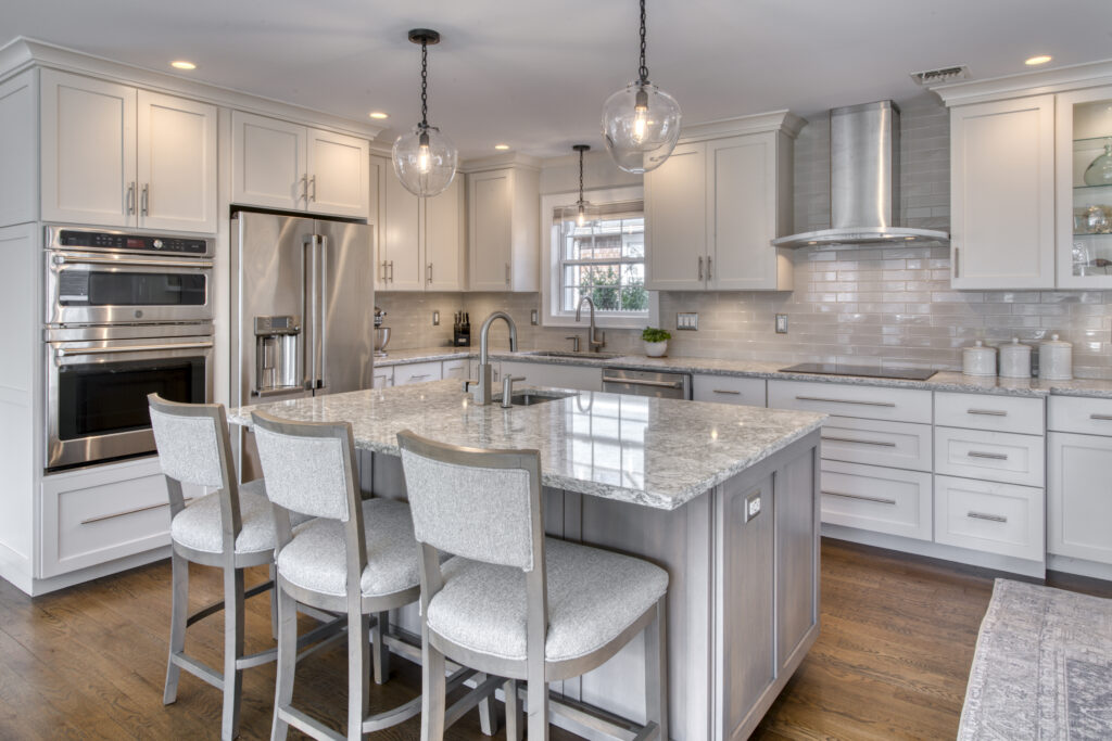 The 136-square-foot kitchen was fully renovated with shaker-style cabinets, quartz countertops and stainless steel appliances. The center island has a convenience sink and seats three.