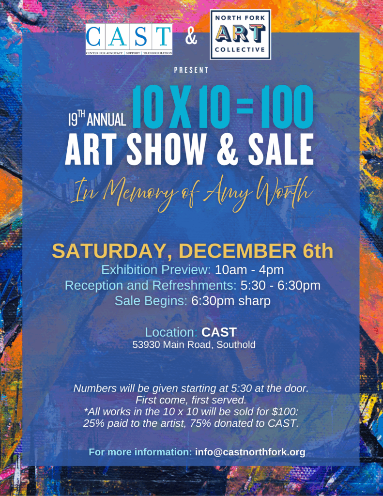 This Saturday, December 6th, join CAST and the North Fork Art Collective for the 19th Annual 10×10 Art Show & Sale In Memory of beloved North Fork artist Amy Worth.