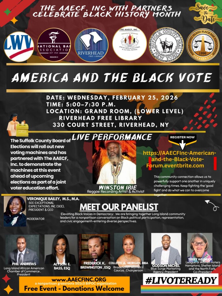 Riverhead, NY — A nonpartisan forum titled “America and the Black Vote” will be held on Wednesday, February 25, at 5:00 p.m. at the Riverhead Free Library, bringing together civic leaders, attorneys, and advocates to discuss Black political participation and its impact on American democracy. The program will also feature a special performance by recording artist Winston Irie, along with a musical presentation of “Lift Every Voice and Sing” & other Musical Favorites by Musician Minister Ted Turpin.