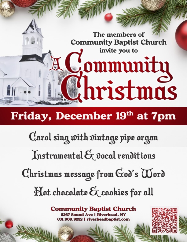 Join Community Baptist Church for our annual Christmas celebration on Friday, December 19th, at 7:00 pm. There will be a traditional carol sing with our pipe organ, choral and instrumental songs, and a message from God’s Word, followed by hot chocolate and cookies. There is no cost to attend, all are welcome. Join us in celebrating A Community Christmas!