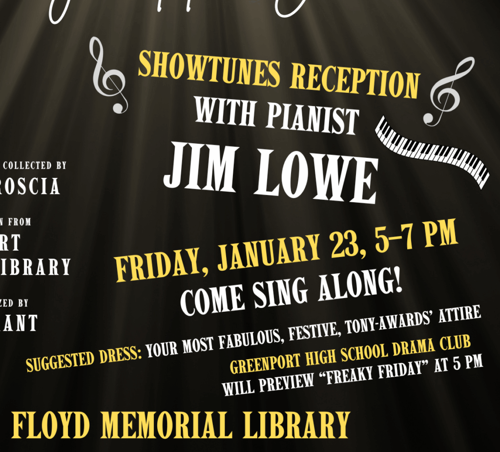 To celebrate Floyd Memorial Library’s current exhibition, Playbill Throughout the Years, we’re throwing a showtunes reception on Friday, January 23 from 5–7 pm. Hosted by Huck Hirsch of North Fork Community Theatre, the evening will feature pianist Jim Lowe and several vocalists. While they will perform songs from Broadway musicals, we’re channeling NYC’s iconic piano-bar Marie’s Crisis, so everyone is welcome to come sing along!