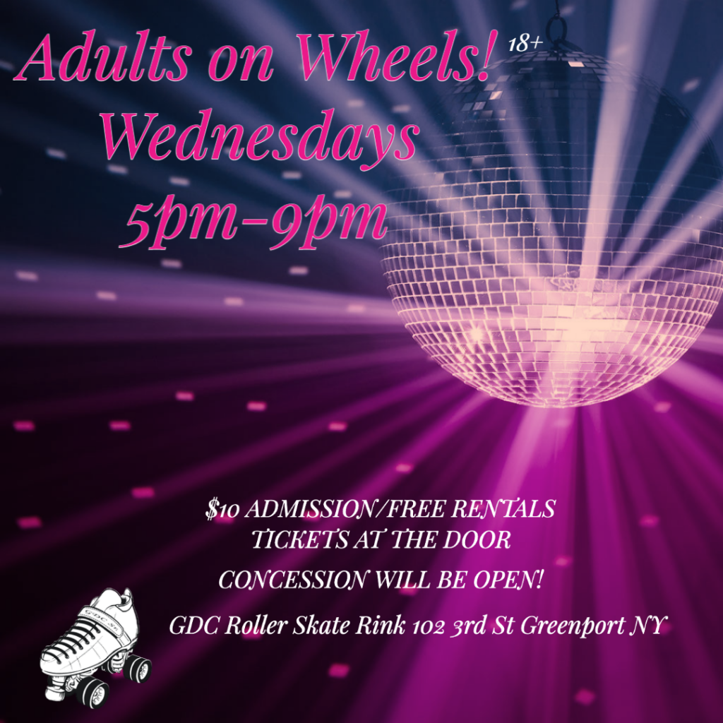 Join the fun! Adults on wheels every Wednesday night year round. Now open to ages 18 ! Open from 5pm-9pm all summer. Great music, fun lighting, great vibe. $10 admission includes rental skates. Potter’s Cafe’ is open serving pizza-hot dogs-snacks-drinks. All menu items are $4 or less.