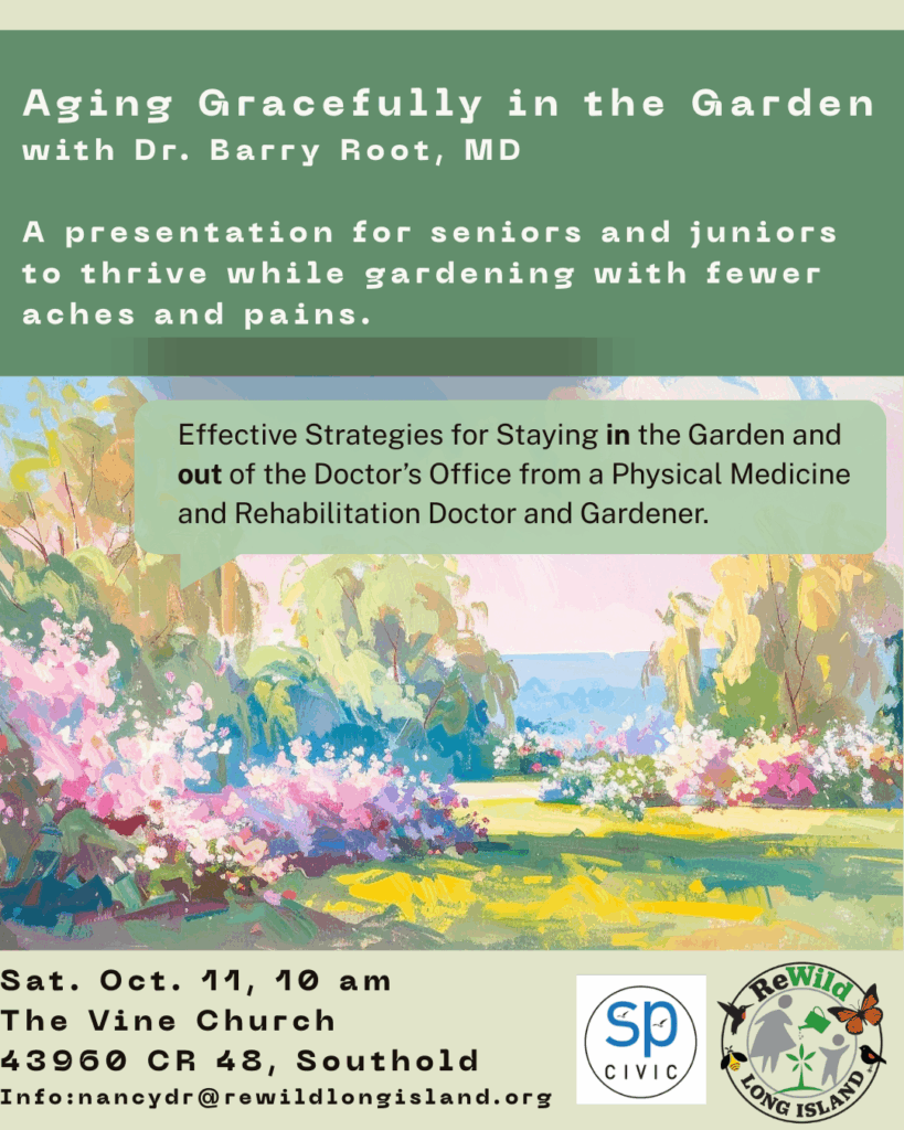 The next ReWild Long Island / North Fork meeting is on Saturday, October 11, 10 am, at the Vine Church, Southold. Guest Presenter: Dr. Barry Root, MD, with a fascinating presentation, on “How to age gracefully in the garden and stay out of the doctor’s office.” Bring your questions and leave your pains behind. Listen to your body and to the doctor! Share your questions to [email protected].