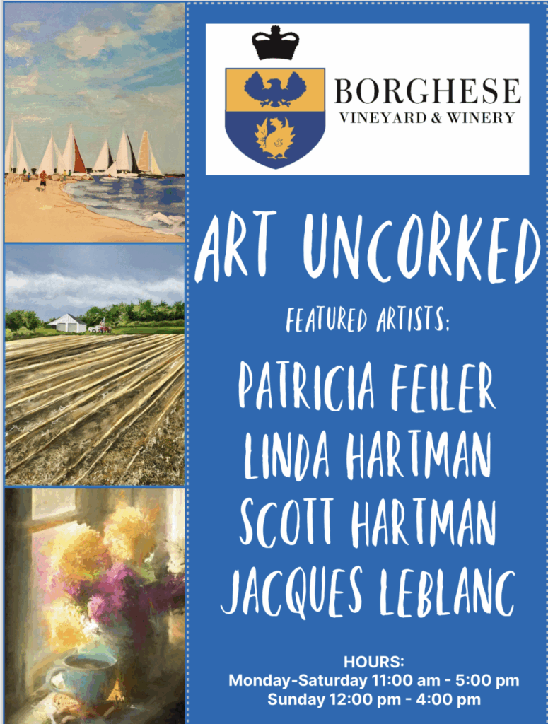 “Art Uncorked” a unique art show featuring new works by artists Patricia Feiler, Linda Hartman Scott Hartman and Photographer Jacques LeBlanc. Reception Sunday, November 16 @ 4-6 pm light refreshments and a complimentary glass of Borghese Sparkling Rose. Cash Bar available.