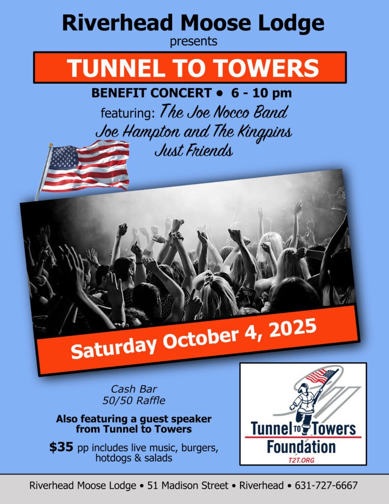 The Riverhead Moose Lodge is having a benefit concert for Tunnel to Towers. This happens on Saturday October 4, 2025, from 6 – 10 pm. Featuring live music by The Joe Nocco Band, Joe Hampton and The Kingpins, and Just Friends. $35 pp includes live music, burgers, hotdogs and salads. Cash bar and a 50/50 raffle. Also featuring a guest speaker from Tunnel to Towers.