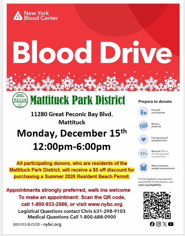 All participating donors who are residents of the Mattituck Park District will receive a $5 off discount for purchasing a Summer 2026 Resident Beach Permit.