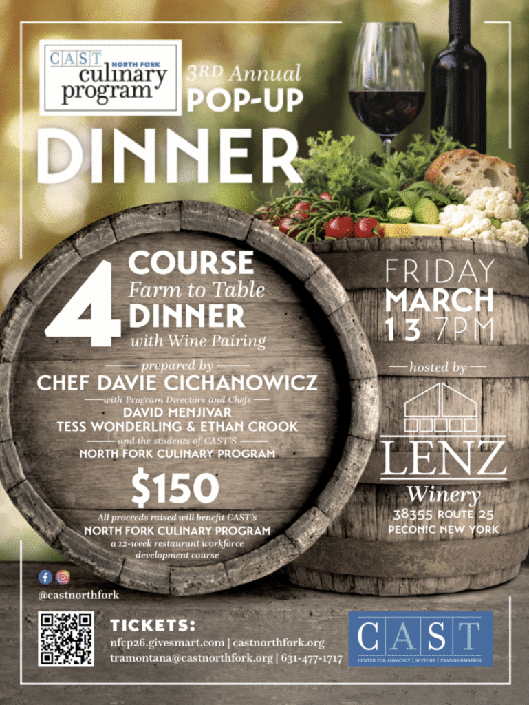 Join us on Friday, March 13, at 7 PM for our 3rd Annual Pop-Up Dinner benefiting CAST’s North Fork Culinary Program. Enjoy a farm-to-table dinner with wine pairing, prepared by Chef Davie Cichanowicz, our program chefs, and the talented students of CAST’s North Fork Culinary Program.