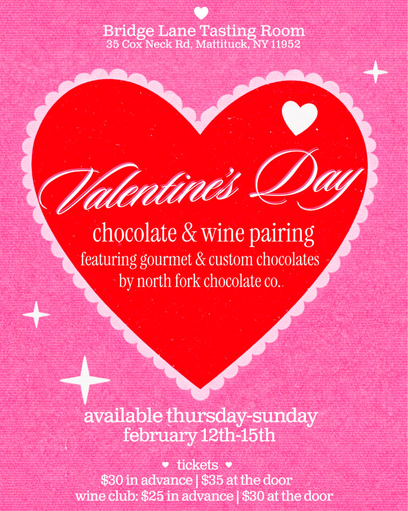 Enjoy a tasting of 4 Bridge Lane wines paired with gourmet chocolates from North Fork