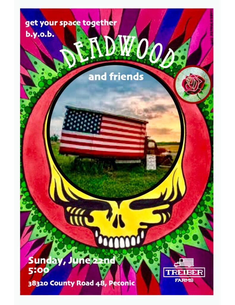 DEADWOOD & Friends Allstar lineup of local musicians celebrate the music of the Grateful Dead Treiber Barn Sunday 6/22 5:00 Food Trucks BYOB, Rain or shine Rt. 48 Peconic NY